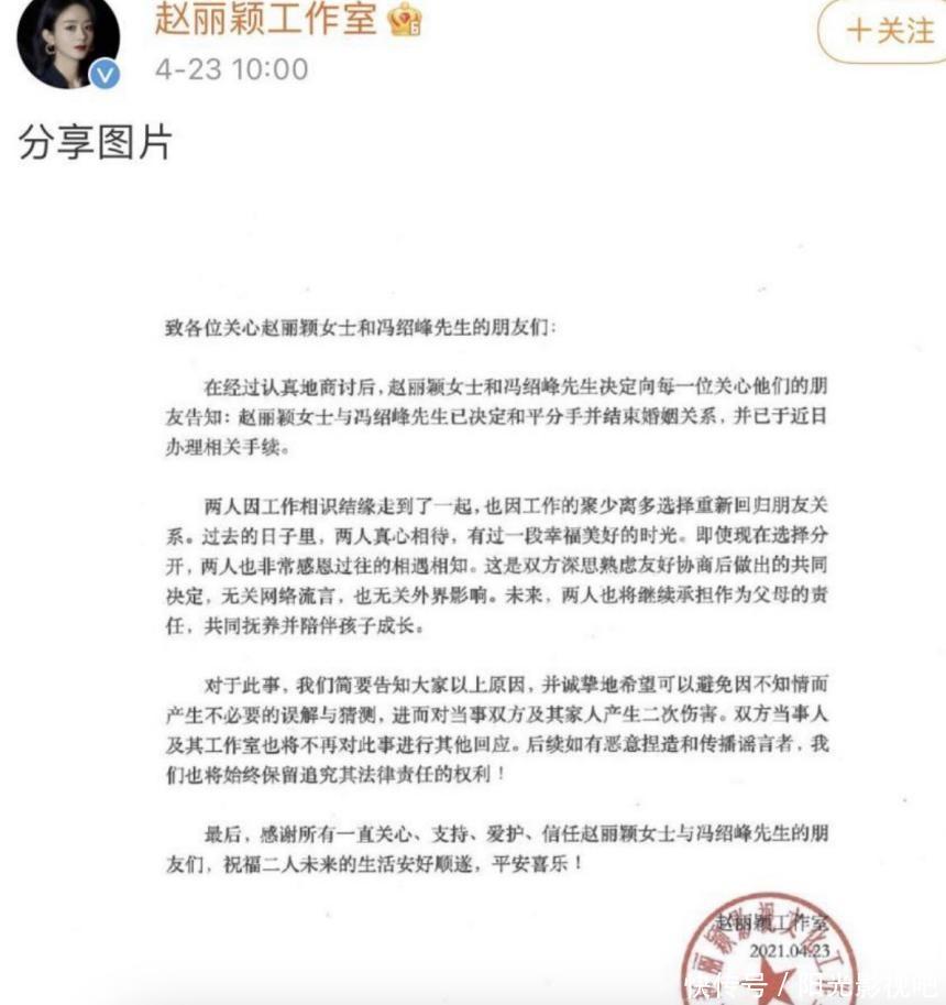 没念念到,2018年10月,冯绍峰与赵丽颖就官宣娶妻,次年通知孕珠生子。就在全球期待这对爱妻熬成文娱圈圭臬爱妻的时候,2022年两东说念主倏得通知分离。