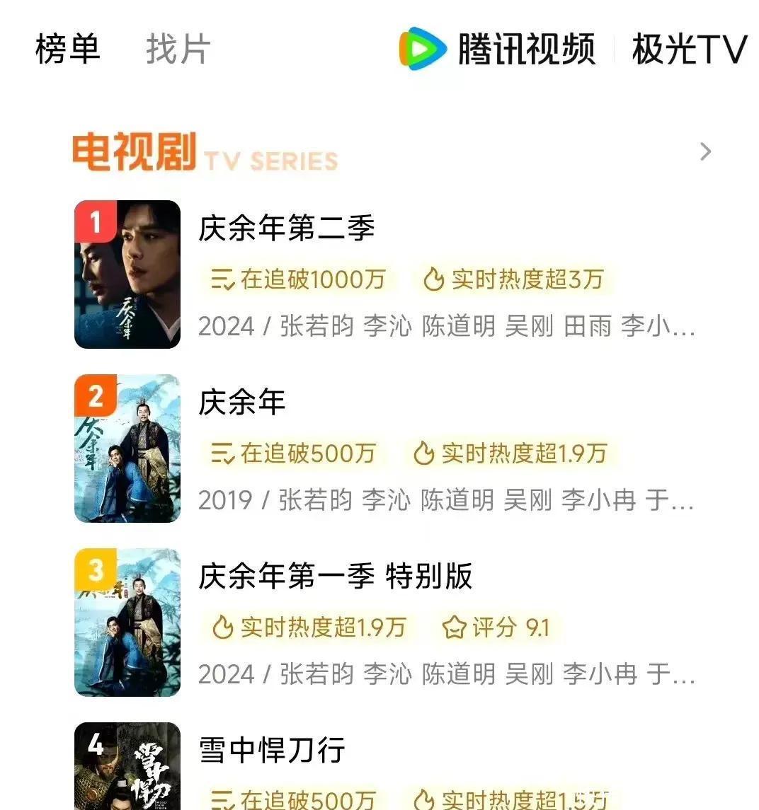 目下,张若昀主演的4部剧,《庆余年第二季》《庆余年第一季》《庆余年第一季稀薄版》《雪中悍刀行》,稳居腾讯视频电视剧热搜榜前四名,合手续霸榜,不得不说,张若昀和范闲相通牛。
