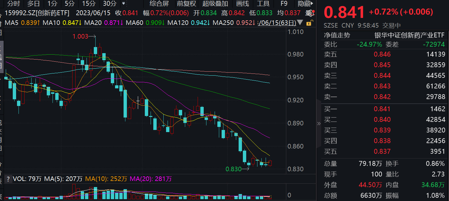为止9:58,窜改药ETF(159992)当天现上升0.72%,成交额达6630万元,成交额握续扩大。